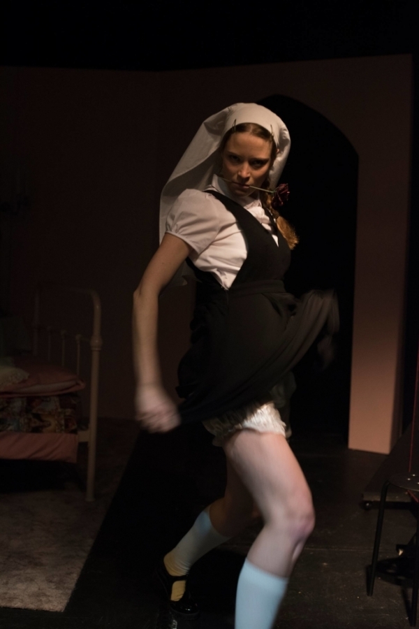 The production design was certainly memorable: set designer Reiko Tanaka put the small space to very good use, making certain props easily available on a table which was also serving as a private room for nuns to enjoy erotic literature. Sam Killingback’s lighting and Fintan Davies’s sound went hand in hand to create time jumps and a rock n’ roll feel. Finally, the costumes by Alexandra Kapsala and Felicity Wood gave each nun their own personal style and edge – either through their shoes when they were in their habit, or through their choice of underwear when they were undressed.