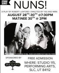 Nuns is a two act play about three rebellious Nuns and how they plot to overthrow the mother superior in order to establish smoking rights for themselves. The youngest, Sister Bernadette is being seduced into the cause by Sister Catharine and Sister Roza during one of their secret smoking sessions. They have a secret that they believe will bring the Mother superior to her knees.